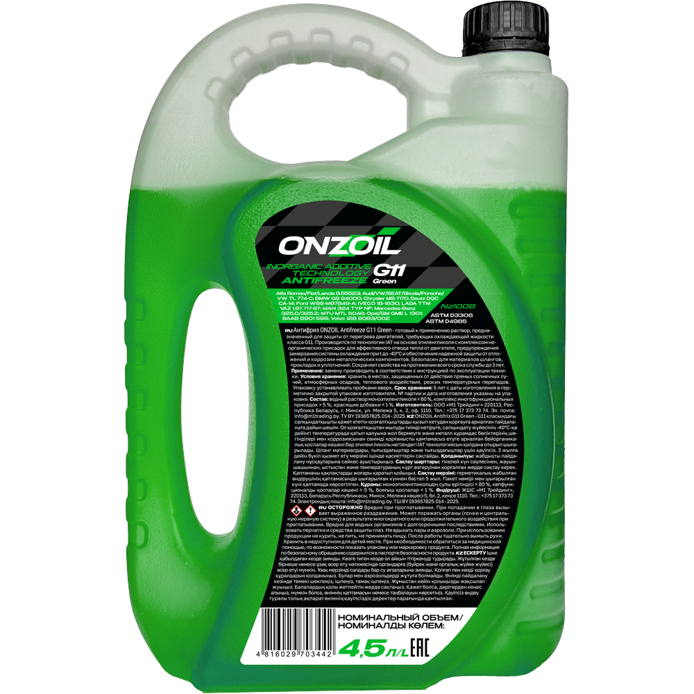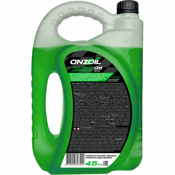 ONZOIL Аntifreeze G11 Green — производится на основе этиленгликоля и содержит комплекс неорганических присадок для эффективного отвода тепла от двигателя, предупреждения замерзания системы охлаждения при температурах до -40°С и обеспечения надежной защиты от отложений и коррозии металлических компонентов. Безопасен для материалов шлангов, прокладок и уплотнений. Сохраняет свои свойства на протяжении всего срока службы — до 3 лет