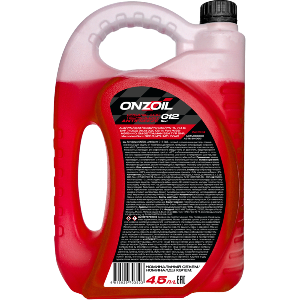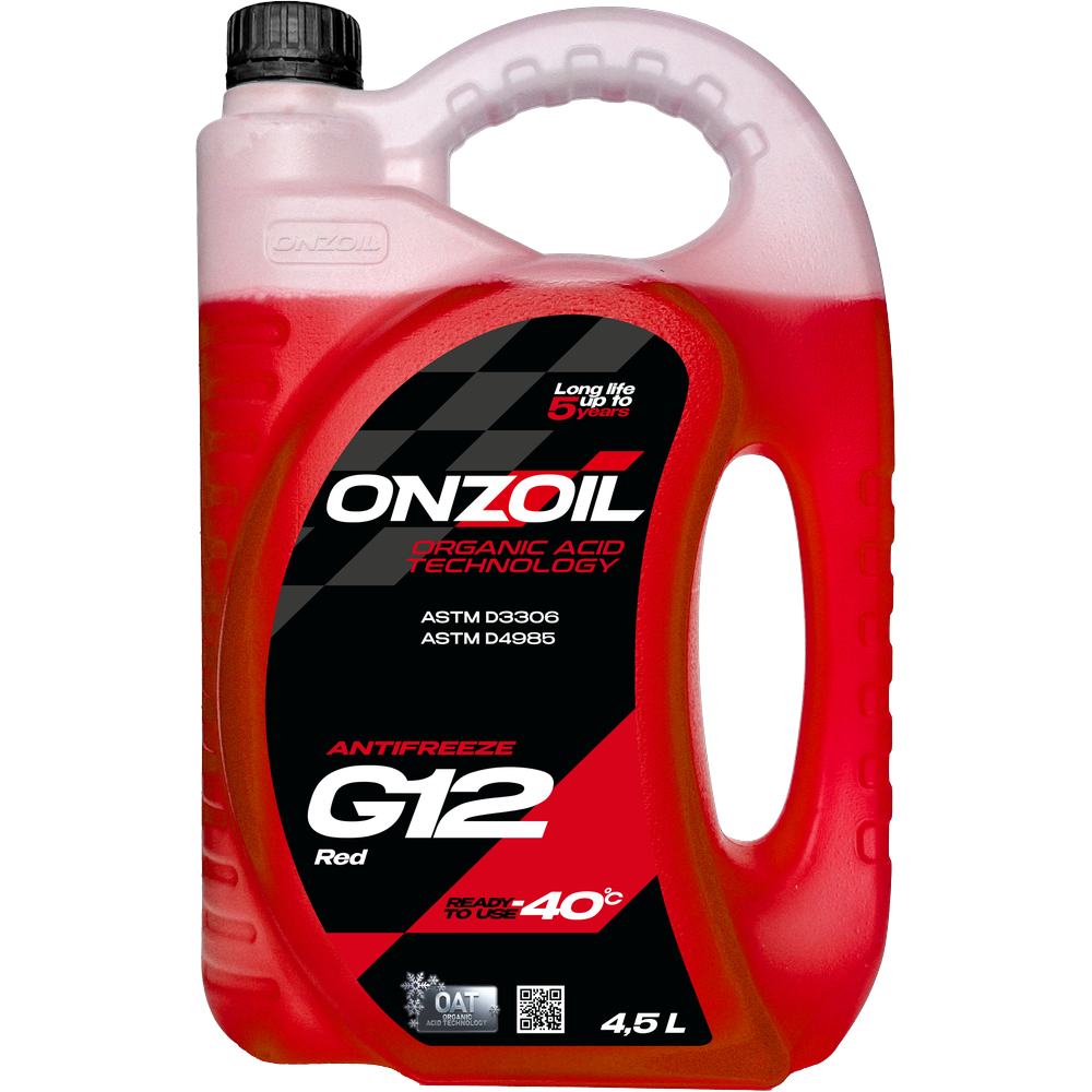 ONZOIL Аntifreeze G12 Red — производится на основе этиленгликоля и содержит комплекс карбоксилатных присадок для эффективного отвода тепла от двигателя, предупреждения замерзания системы охлаждения при температурах до -40°С и обеспечения высокой степени защиты от отложений и коррозии металлических компонентов. Совместимы с материалами шлангов, прокладок и уплотнений. Имеет пролонгированный срок службы — до 5 лет! Сохраняет свои свойства на протяжении всего срока службы