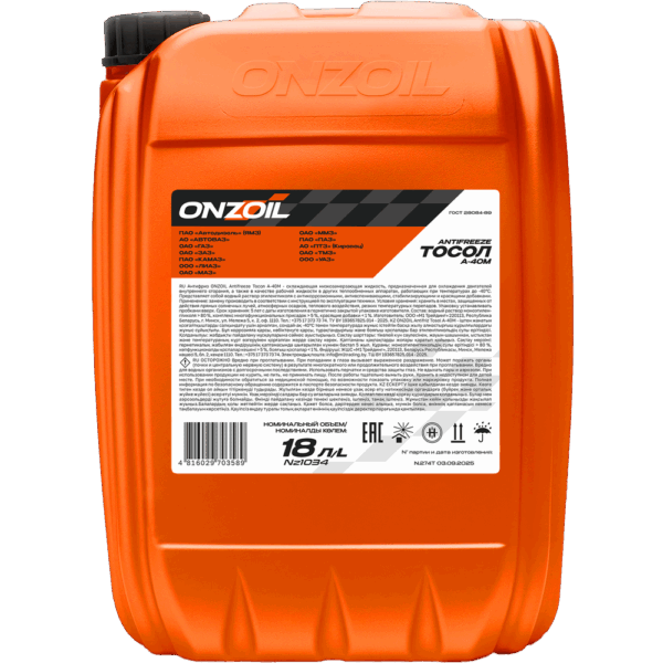 ONZOIL Antifreeze Тосол А-40М — представляет собой водный раствор этиленгликоля с антикоррозионными, антивспенивающими, стабилизирующими и красящими добавками