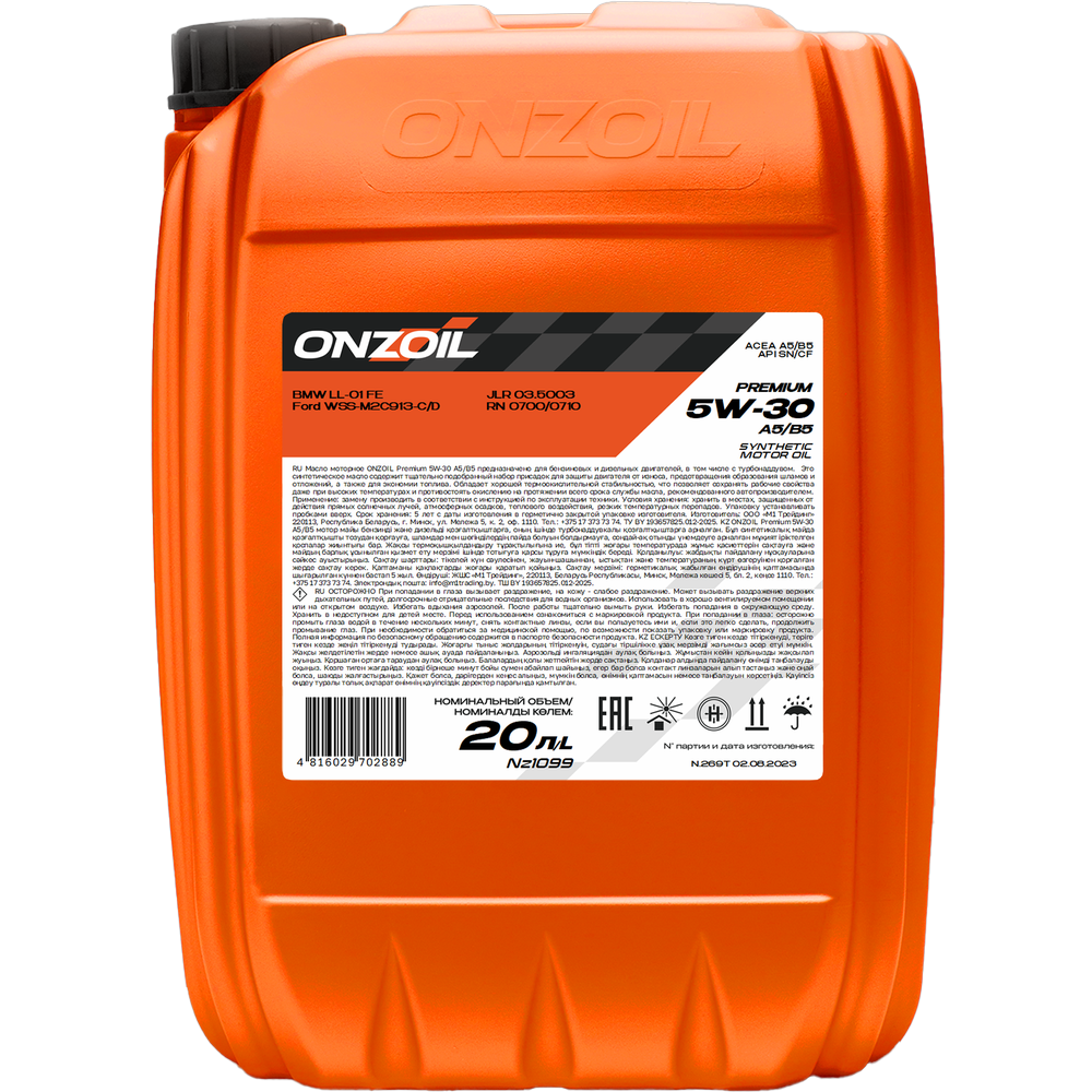 ONZOIL Premium 5W-30 A5/B5 – это синтетическое моторное масло благодаря высококачественному пакету присадок обеспечивает надежную защиту двигателя от износа и продлевает срок его службы. Эффективно предотвращает образование шламов и отложений, поддерживая чистоту мотора. Высокая термоокислительная стабильность сохраняет свойства масла даже при экстремальных нагрузках, а сбалансированная вязкость способствует экономии топлива, уменьшая потери на трение. Долговечность масла гарантирует его эффективность на протяжении всего рекомендованного производителем срока службы