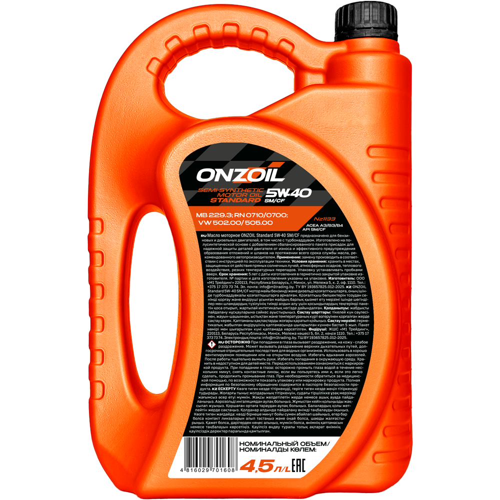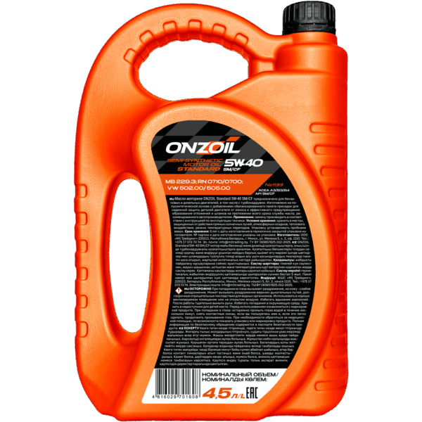 ONZOIL Standard 5W-40 SM/СF – полусинтетическое моторное масло, содержащее сбалансированный пакет присадок, который эффективно защищает двигатель от износа и предотвращает образование отложений и шламов. Масло поддерживает оптимальную работу двигателя и сохраняет свои свойства на протяжении всего рекомендованного автопроизводителем интервала замены