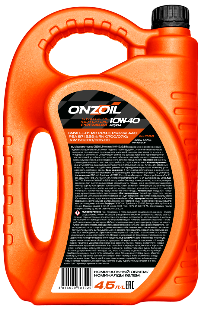 ONZOIL PREMIUM 10W-40 A3/B4 – синтетическое моторное масло, содержащее специальные присадки для защиты двигателя от износа и образования углеродных отложений. Обеспечивает стабильную работу двигателя при высоких температурах и нагрузках. Отличается высокой окислительной устойчивостью и сохраняет свои свойства на протяжении всего рекомендованного автопроизводителем интервала замены.