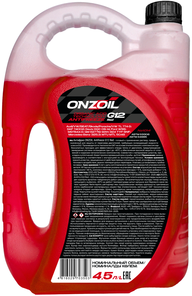 ONZOIL АNTIFREEZE G12 RED – производится на основе этиленгликоля и содержит комплекс карбоксилатных присадок для эффективного отвода тепла от двигателя, предупреждения замерзания системы охлаждения при температурах до -40°С и обеспечения высокой степени защиты от отложений и коррозии металлических компонентов. Совместимы с материалами шлангов, прокладок и уплотнений.
