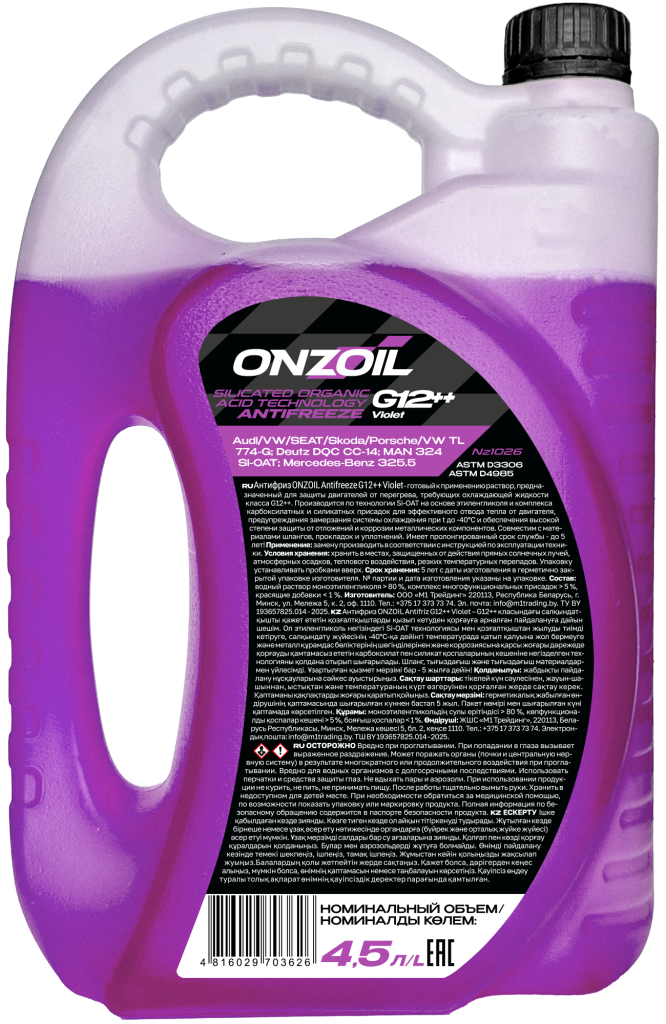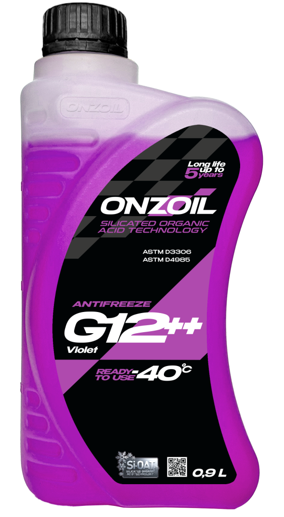 ONZOIL АNTIFREEZE G12++ VIOLET – производится на основе этиленгликоля и содержит комплекс карбоксилатных и силикатных присадок для эффективного отвода тепла от двигателя, предупреждения замерзания системы охлаждения при температурах до -40°С . Объединяет преимущества карбоксилатных (OAT) ингибиторов и силикатной защиты, обеспечивая усиленное предотвращение коррозии и образования отложений. Совместимы с материалами шлангов, прокладок и уплотнений. Имеет пролонгированный срок службы - до 5 лет! Сохраняет свои свойства на протяжении всего срока службы.