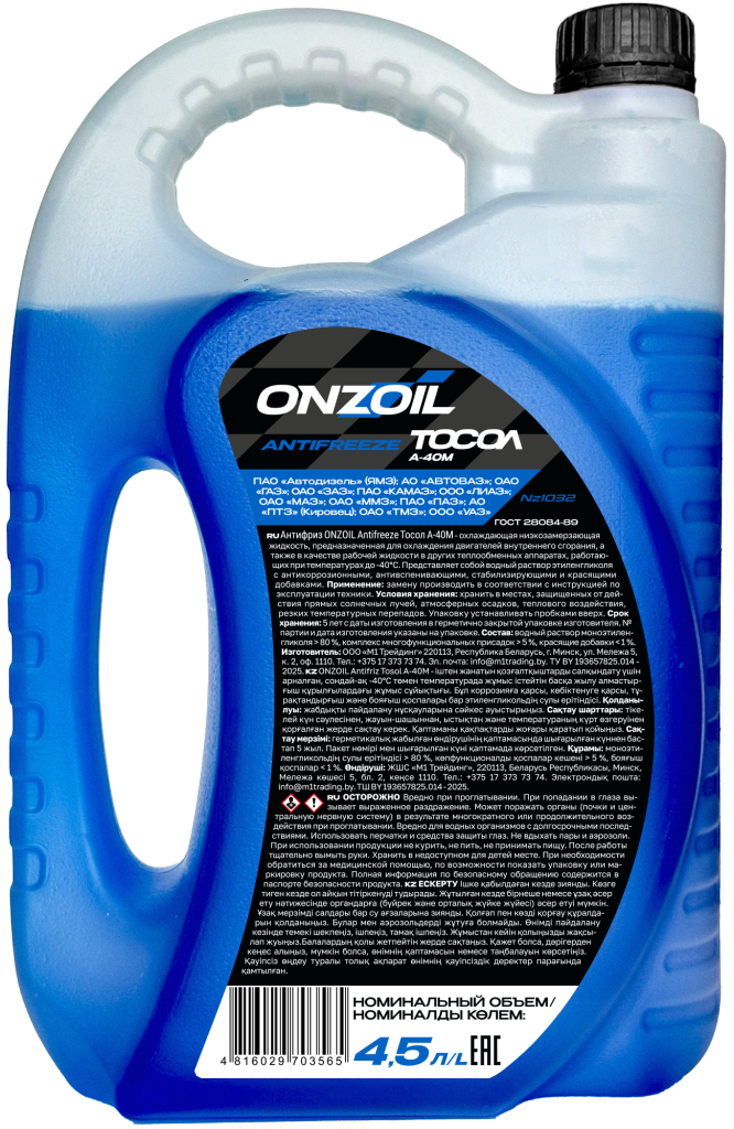 ONZOIL ANTIFREEZE ТОСОЛ А-40М – представляет собой водный раствор этиленгликоля с антикоррозионными, антивспенивающими, стабилизирующими и красящими добавками.